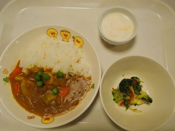 さつまいものひき肉カレー・ブロッコリーの彩りサラダ・フルーツヨーグルト