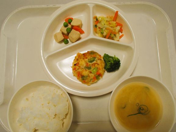 玄米ごはん・豆腐入りチキンナゲット・南瓜サラダ・えのきともやしの味噌汁・りんご