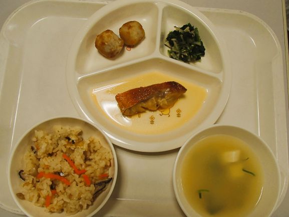 さつまいもごはん・ぶりの照り焼き・ほうれん草の胡麻よごし・里芋饅頭・柚のお吸い物