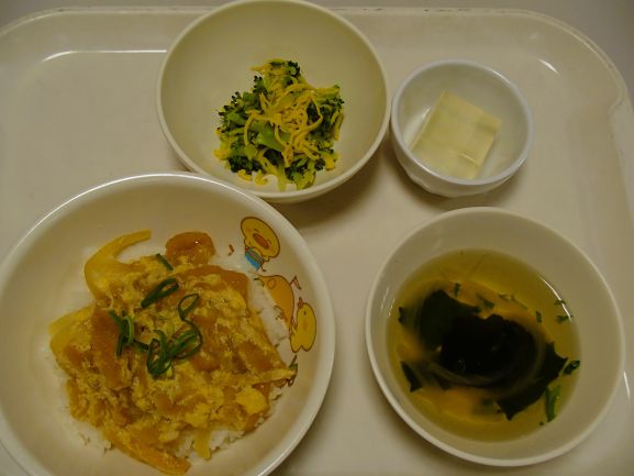 衣笠丼・ブロッコリーのごま和え・りんごゼリー・玉ねぎとわかめのすまし汁