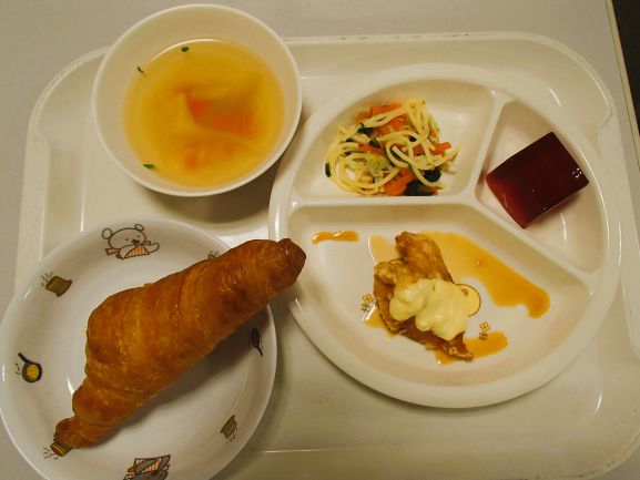 クロワッサン・スパニッシュオムレツ・キャロットラペ風・ぶどうゼリー・コンソメスープ