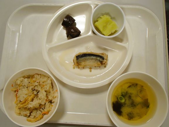 きのこご飯・さんまの揚げ浸し・秋なすのオランダ煮・柿・わかめと豆腐の味噌汁