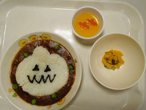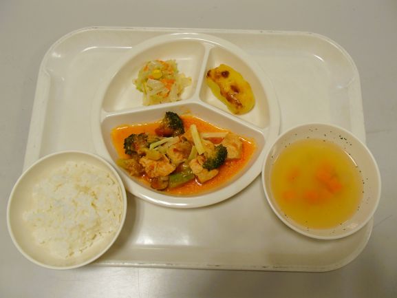 さつまいものひき肉カレー・ブロッコリーの彩りサラダ・フルーツヨーグルト