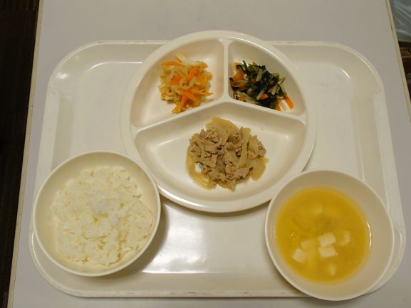 玄米ごはん・鶏肉と大根の照り煮・水菜ともやしのお浸し・卯の花・さつまいもとえのきの味噌汁