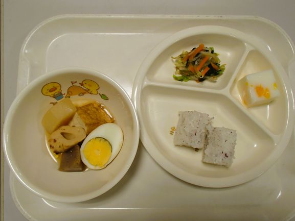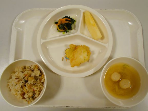 梅ひじきごはん(年長さんが作った梅干しを使っています)・さわらの柚風味竜田揚げ・ほうれん草の白和え・わらびもち・じゃがいもとしめじの味噌汁