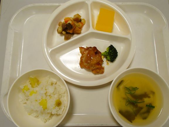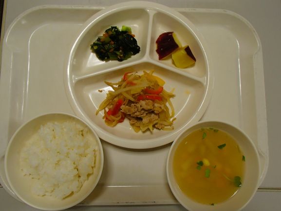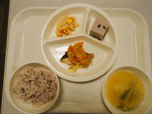 玄米ご飯・さつまいもコロッケ・白菜のゆず和え・かみかみ金平・大根とえのきのすまし汁