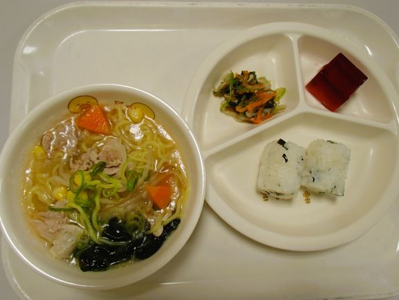 おにぎり・味噌ラーメン・小松菜のお浸し・りんご