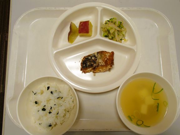 わかめごはん・さばの竜田揚げ・白菜のごま和え・さつまいもの甘煮・豆腐としめじの味噌汁