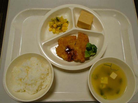 玄米ご飯・トンカツ・大根のサラダ・きなこプリン・わかめと豆腐の味噌汁