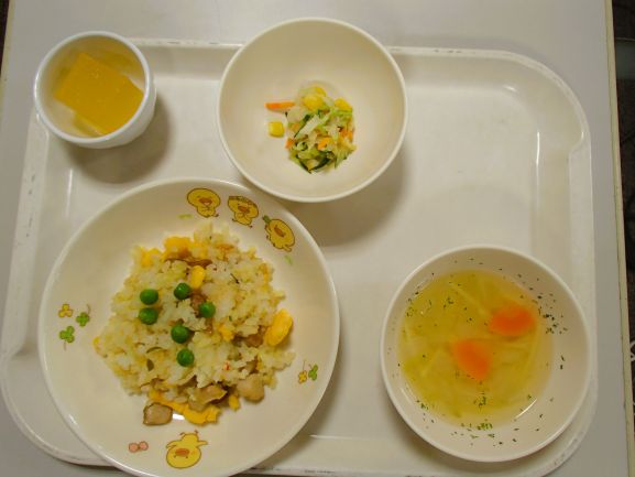 あさりの炊き込みピラフ・カレーマヨネーズサラダ・バナナ・ビーンズスープ