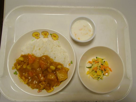 大豆入りカレー・ブロッコリーとコーンの和風サラダ・フルーツヨーグルト
