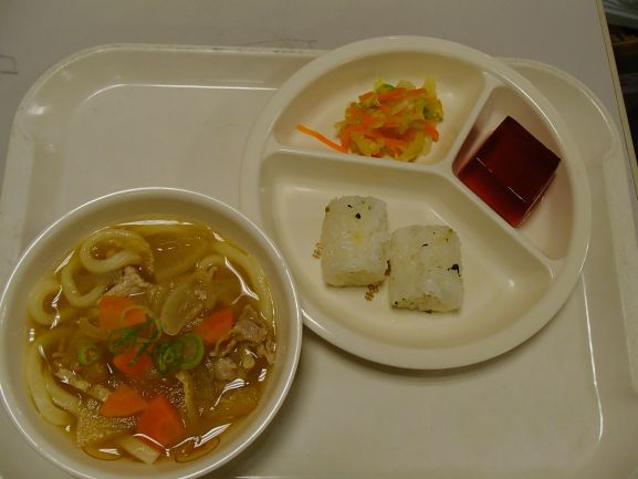 おにぎり(菜飯)・豚汁うどん・白菜のおかか和え・オレンジゼリー