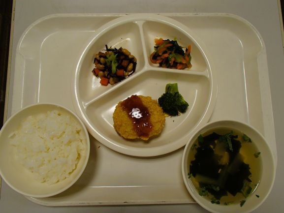 玄米ご飯・かぼちゃコロッケ・キャベツとコーンのサラダ・れんこんの金平・コンソメスープ