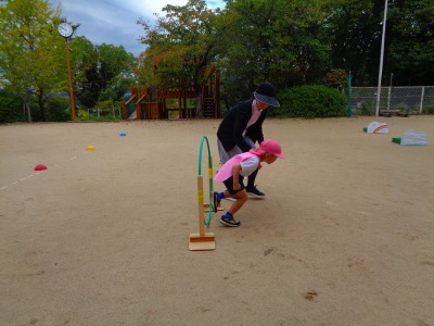 親子で手をつなぎ、フープをくぐり、