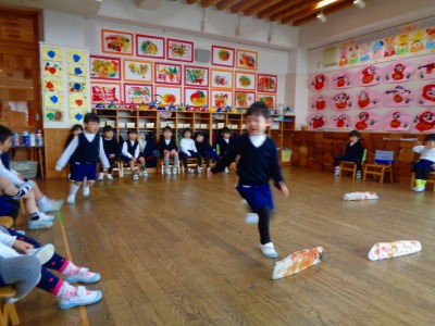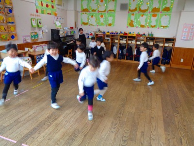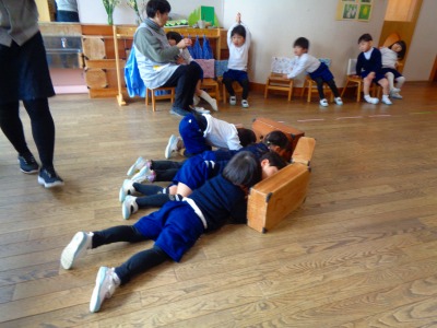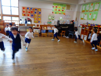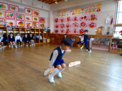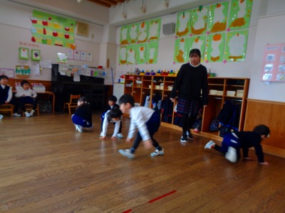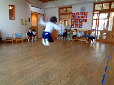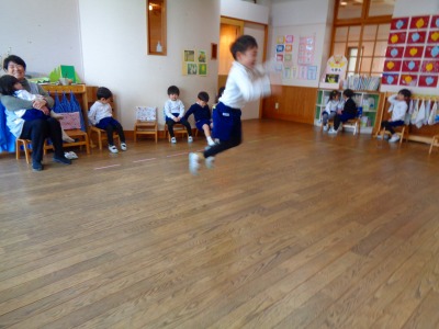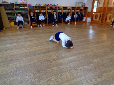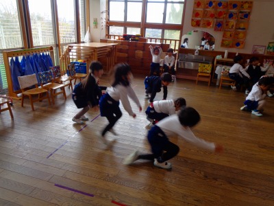 ▼年少組 あひる組 ランニングと「カエルになってジャンプ」