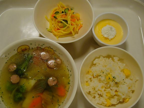 コーンライス・あったかポトフ・スパゲティサラダ・プリン