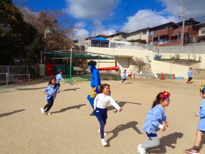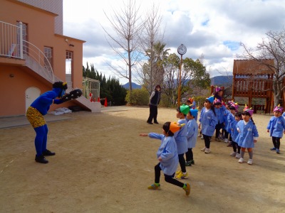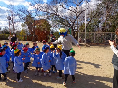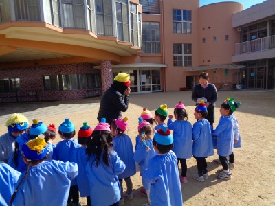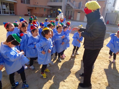 年中・年長組さんは先生は顔を隠して登場!