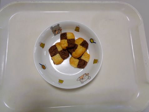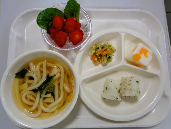 若竹うどん・菜っぱおにぎり・小松菜の卵和え・オレンジ入り牛乳かん