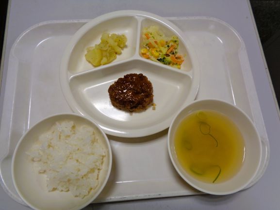 玄米ごはん・照り焼き豆腐ハンバーグ・コールスローサラダ・新じゃがのソテー・エノキと玉ねぎの味噌汁