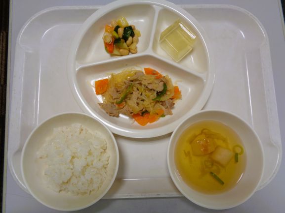 玄米ごはん・豚肉と春雨炒め・五目豆のサラダ・りんごゼリー・麩ともやしのすまし汁