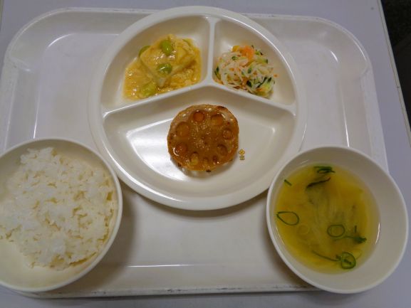 玄米ごはん・れんこん鶏つくね・ビーフンのサラダ・かき玉あんかけ豆腐・わかめと玉ねぎの味噌汁