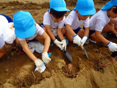 青空が広がるとても良いお天気の中、川西の東畦野までお芋ほり遠足に出かけました。行きのバスでは、子どもたちがたくさん掘って持って帰ろうと、とても楽しみにしていました。畑に着いて軍手とスコップを準備して、張り切って掘りはじめました。土はほっこりとやわらかくて比較的掘りやすく、すぐにお芋の頭が顔を出しました。最初は、なるべく先生たちも手伝わないでお芋の周りの土を掘るように励ましました。子どもたちは、自...