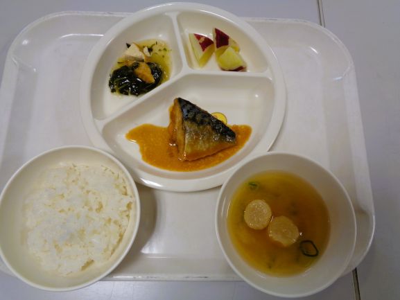 わかめごはん・さばの竜田揚げ・白菜のごま和え・さつまいもの甘煮・豆腐としめじの味噌汁