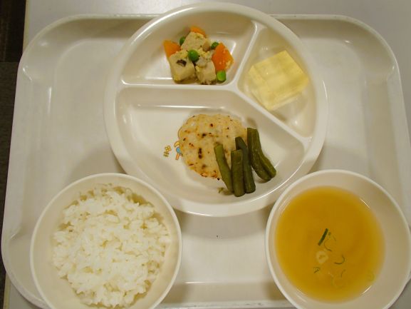 玄米ごはん・枝豆チーズつくね・高野豆腐の煮物・白菜とかにかまのごま酢和え・じゃがいもと玉ねぎの味噌汁
