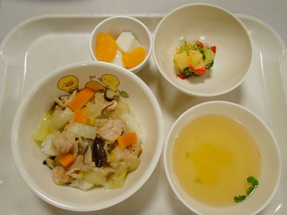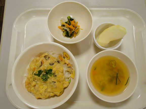 衣笠丼・ブロッコリーのごま和え・りんごゼリー・玉ねぎとわかめのすまし汁