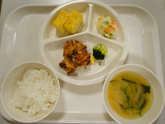 玄米ご飯・鶏肉の竜田揚げ・ポテトサラダ・厚焼玉子・玉ねぎとじゃがいもの味噌汁