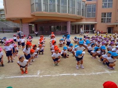 今日は、生憎の雨で、ホールで運動会の練習をしました。年少さんは、体育の「もりもり先生」と一緒にかけっこをしました。両手を握りしめて「ようい」のポーズをとって、「ドン!」で走り出しました。目当ての三角のコーンまで来ると嬉しそうにコーンを握りしめていました。(タッチするだけでいいのですが・・)どの子も、にこにこ嬉しそうに走っていました。▼もりもり先生と一緒に「ようい」のポーズ。なかなかきまっています...