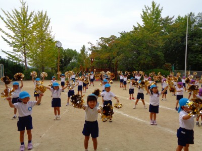 9月になって雨がよく振ります。外に出てとんぼやバッタを探そうと思っていた子どもたちは、少しがっかりしていました。けれども、年中さんは先生からもらって大喜び、早速ポンポンを持って踊りました。黄色のポンポンを持つと、子どもたちは振ったり上にあげたりして部屋の中をあちこち跳ねながら動きまわり、とても嬉しそうでした。音楽をかけてもらうともっと楽しくなって、笑顔で踊っていました。運動会ではポンポンのダンス...