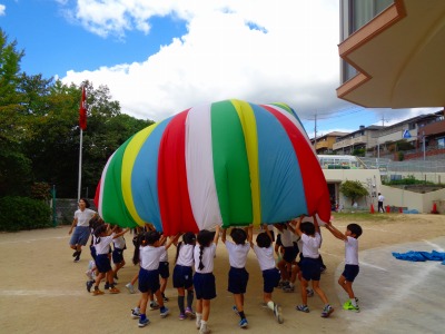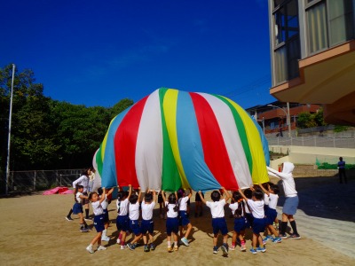 学園幼稚園に行って、運動会で発表した演技の見せ合いっこをしました。お家の方やたくさんのお客様に見て頂いた運動会とは違って、同じ年齢同志どんな演技をしたのか、お互いにわくわくしながらの見せ合いっことなりました。どちらも、組体操とパラバルーンの演技をしました。同じ技、演技がたくさんあって、そのたびに「一緒だー!」「あれ、出来るよね」と興奮気味で観ていました。また、自分たちとは違う技や演技を観て「すご...