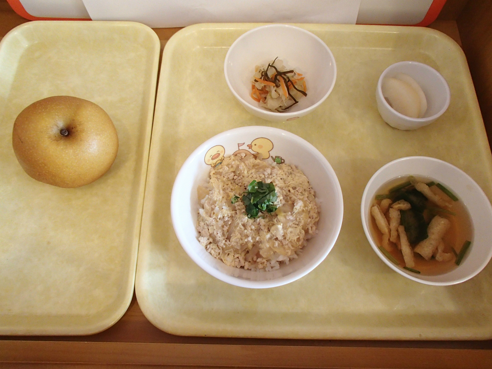 衣笠丼・ブロッコリーのごま和え・りんごゼリー・玉ねぎとわかめのすまし汁