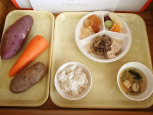 玄米ご飯・さつまいもコロッケ・白菜のゆず和え・かみかみ金平・大根とえのきのすまし汁