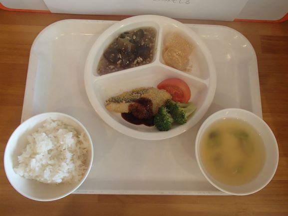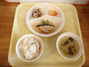 玄米ごはん・かれいの磯辺揚げ・ほうれん草の白和え・千切煮・さつまいもと舞茸の味噌汁