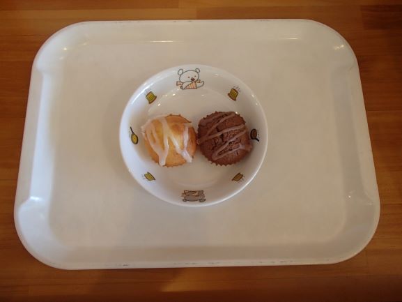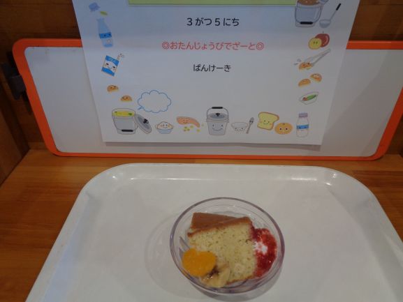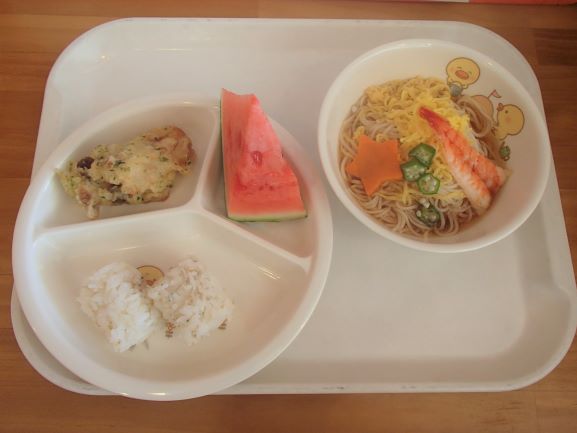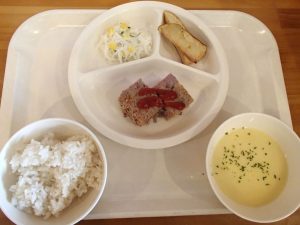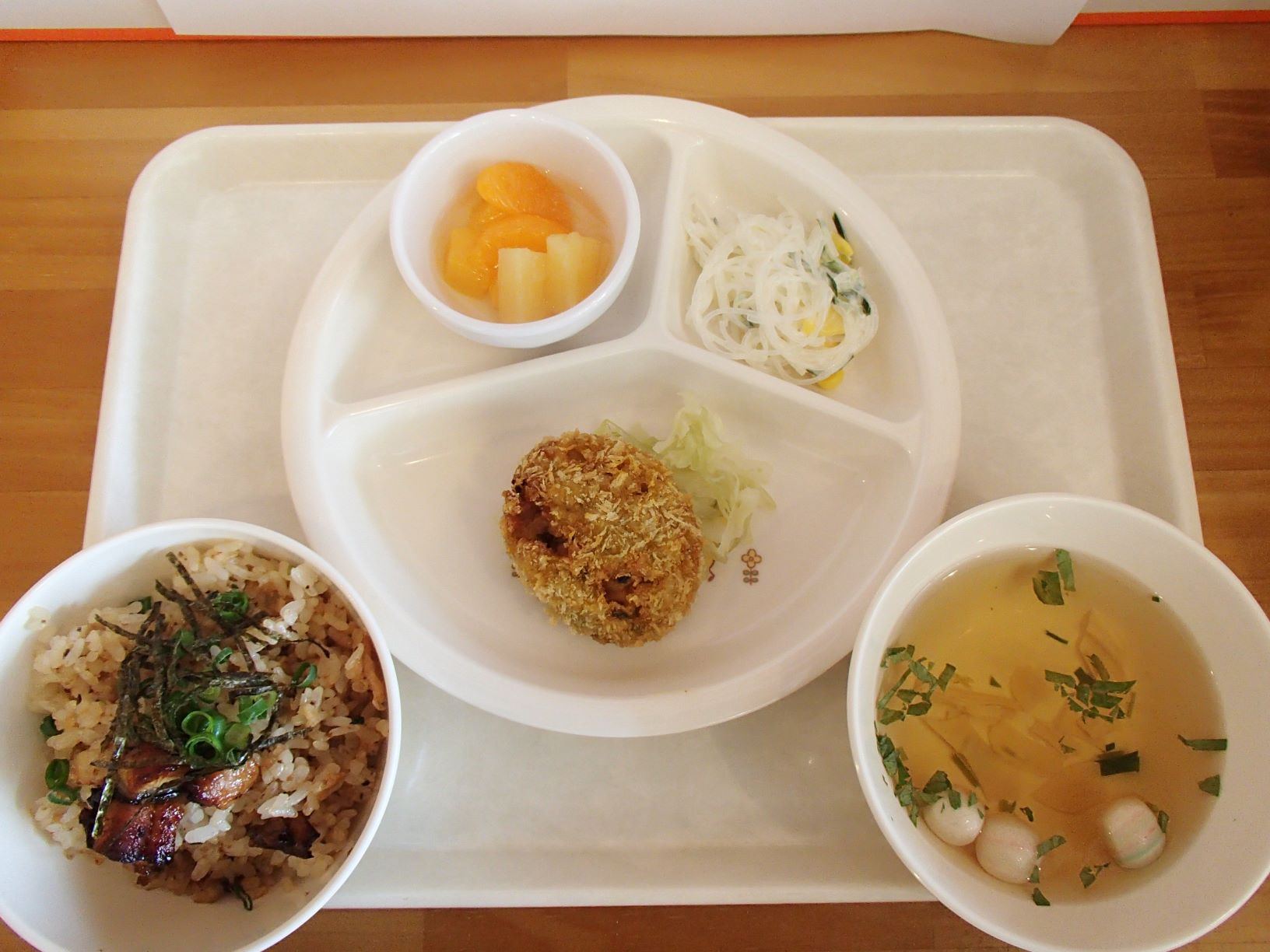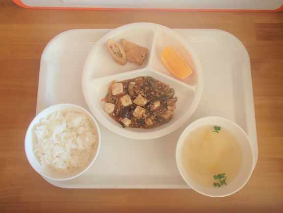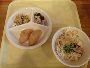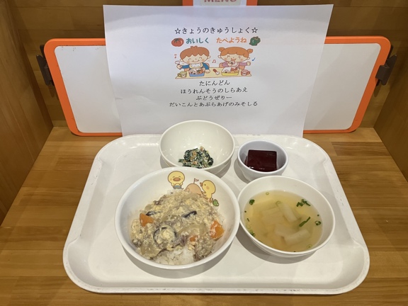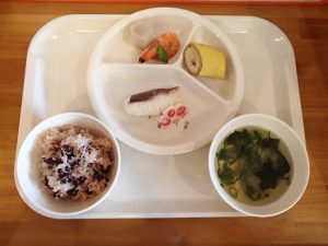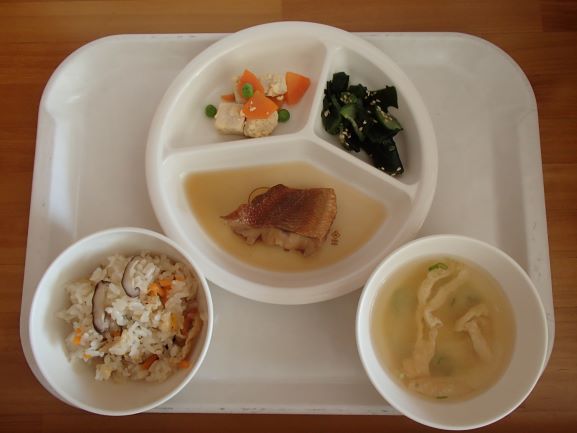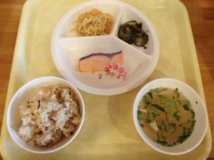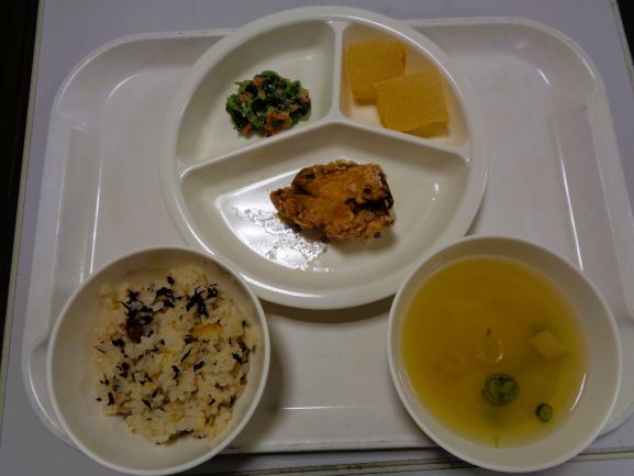 梅ひじきごはん(年長さんが作った梅干しを使っています)・さわらの柚風味竜田揚げ・ほうれん草の白和え・わらびもち・じゃがいもとしめじの味噌汁