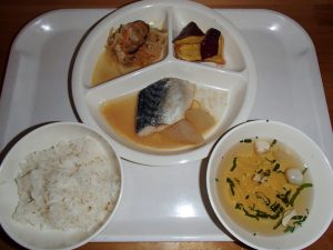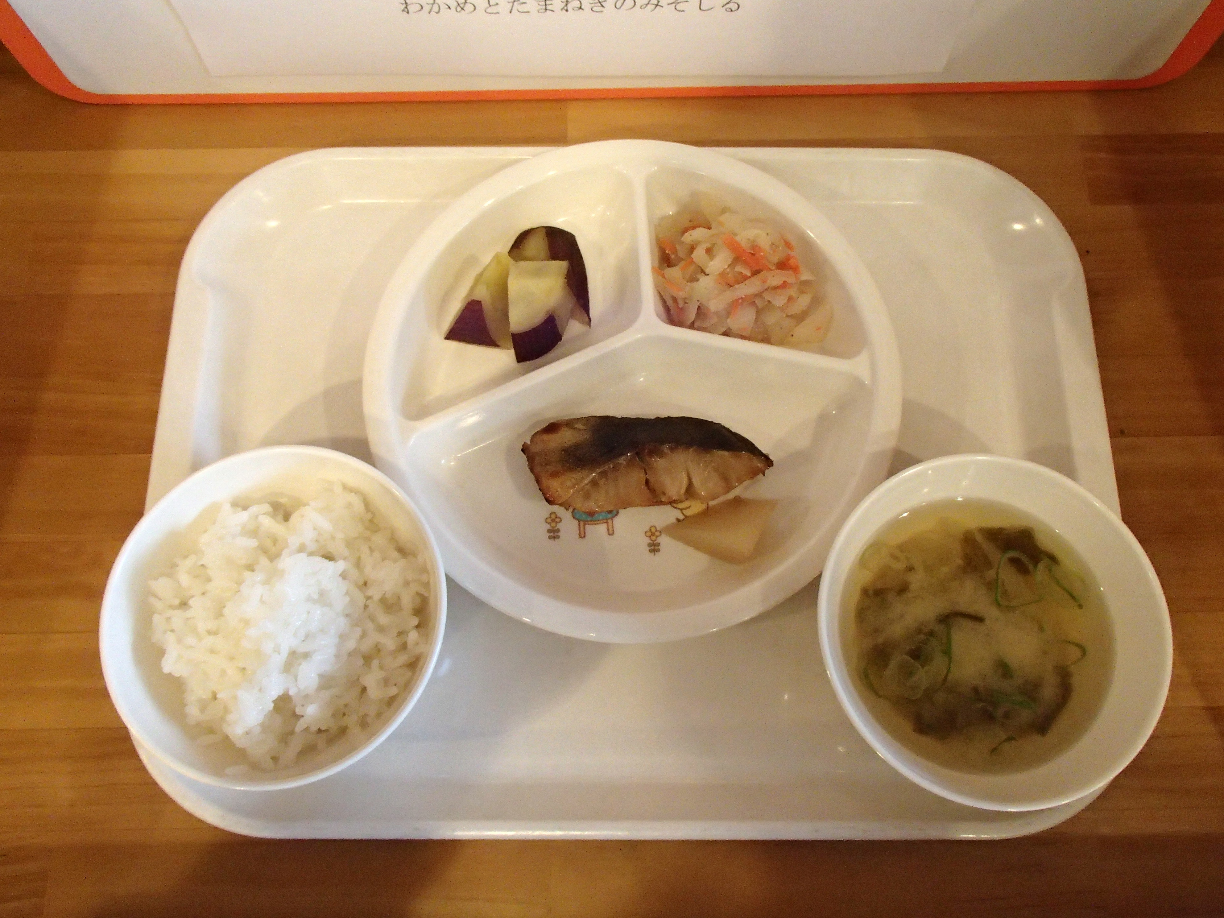 わかめごはん・さばの竜田揚げ・白菜のごま和え・さつまいもの甘煮・豆腐としめじの味噌汁