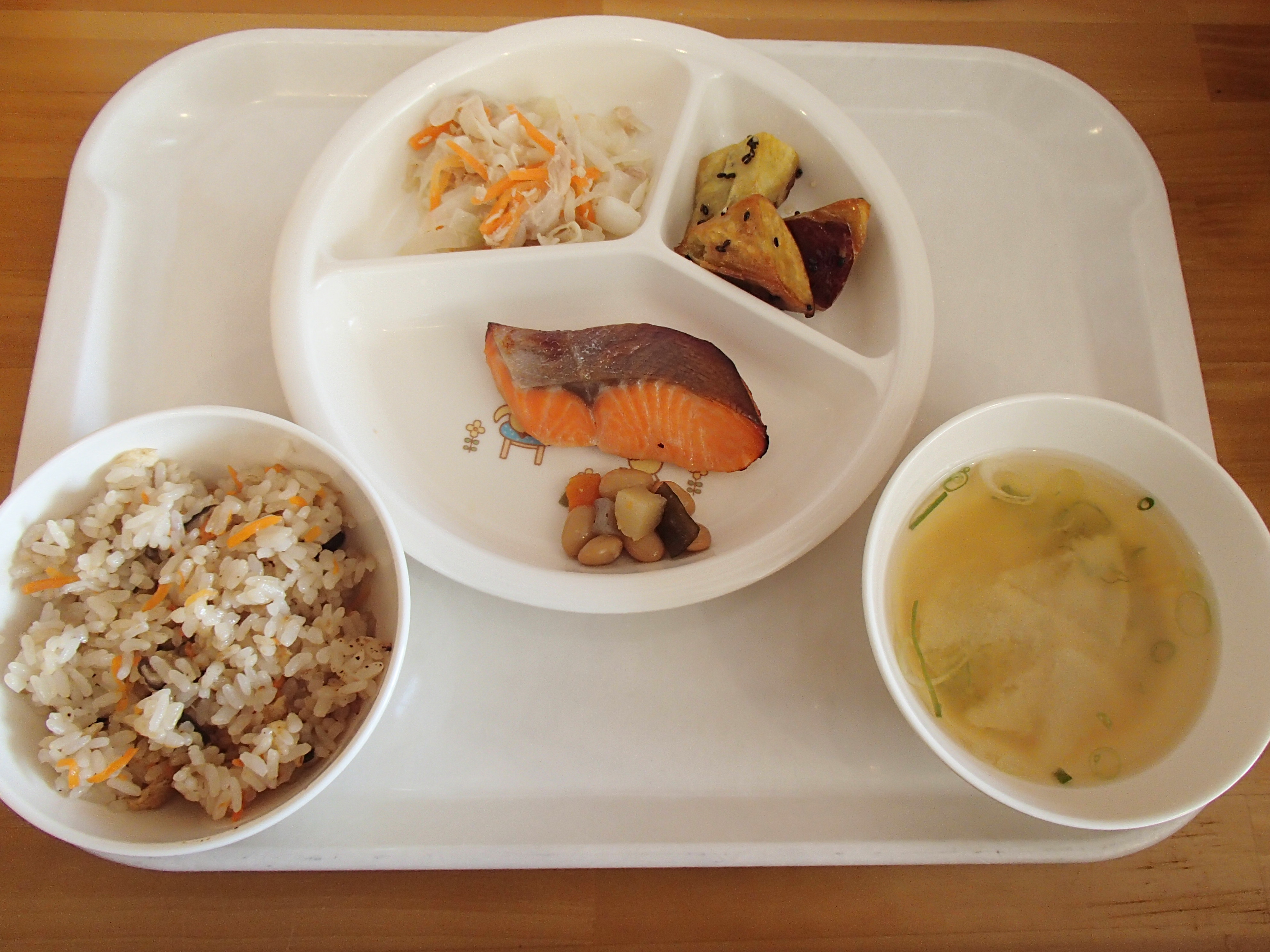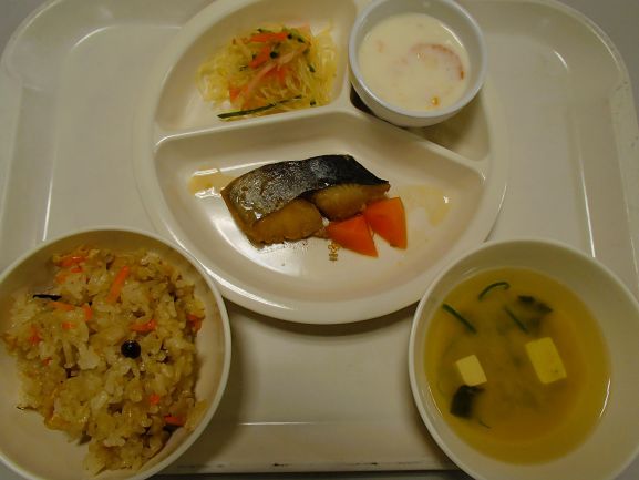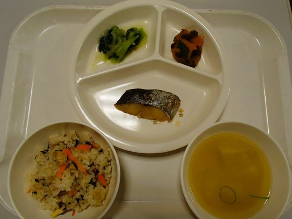 ひじきごはん・鮭の幽庵焼き・大根と小松菜の胡麻和え・かぼちゃのいとこ煮・さといもとえのきの味噌汁