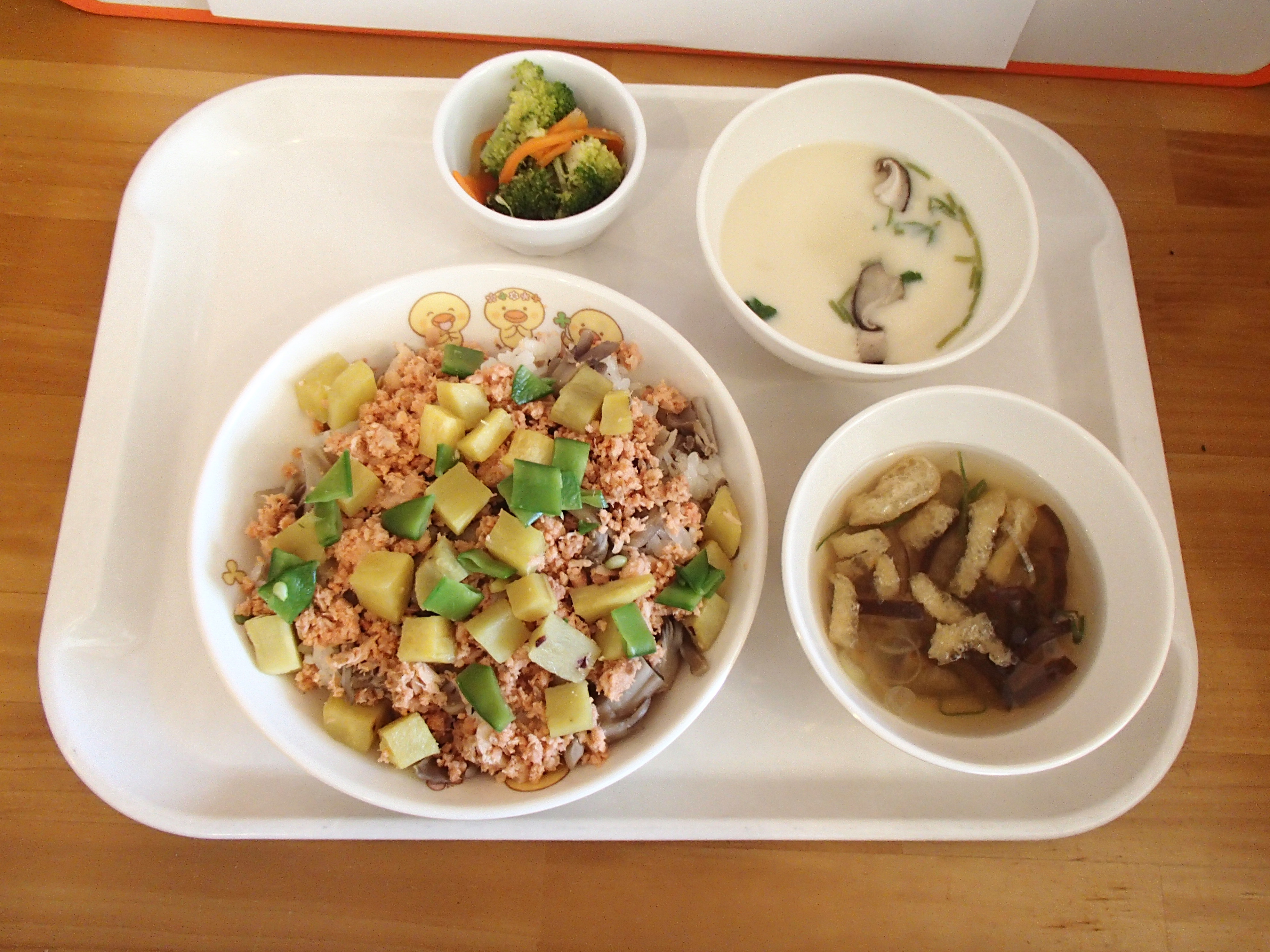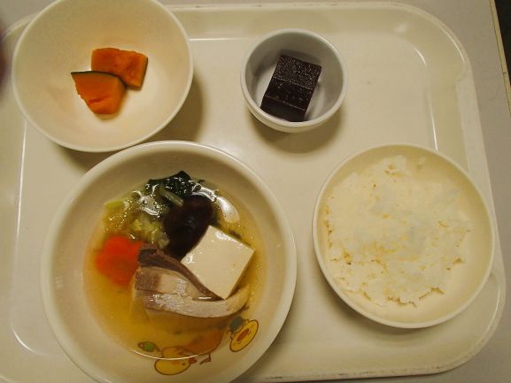 ツナと人参の炊き込みご飯・鶏肉と冬野菜豆乳味噌鍋風・里芋のから揚げ・蜜柑ゼリー
