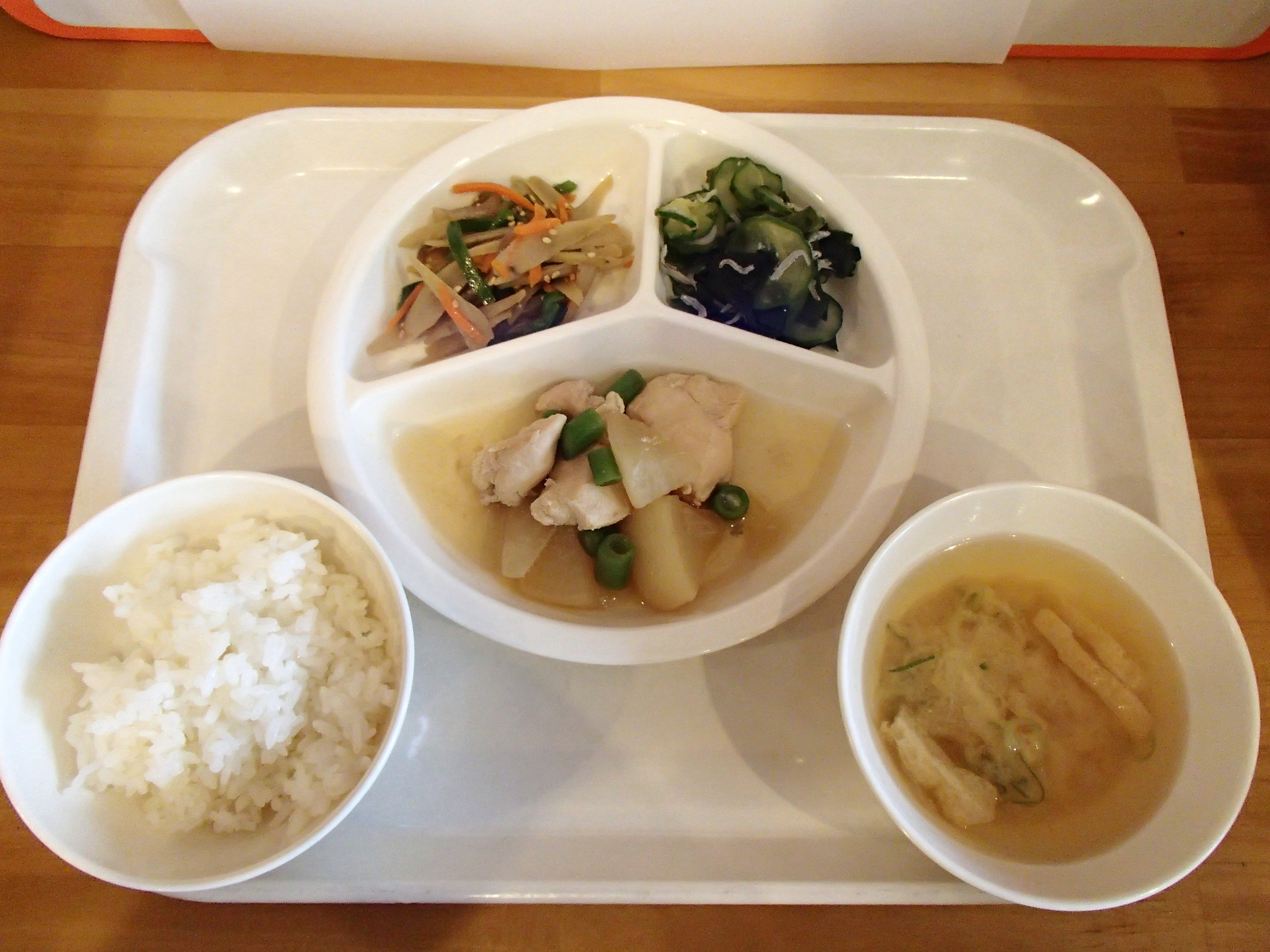 玄米ごはん・鶏肉と大根の照り煮・水菜ともやしのお浸し・卯の花・さつまいもとえのきの味噌汁