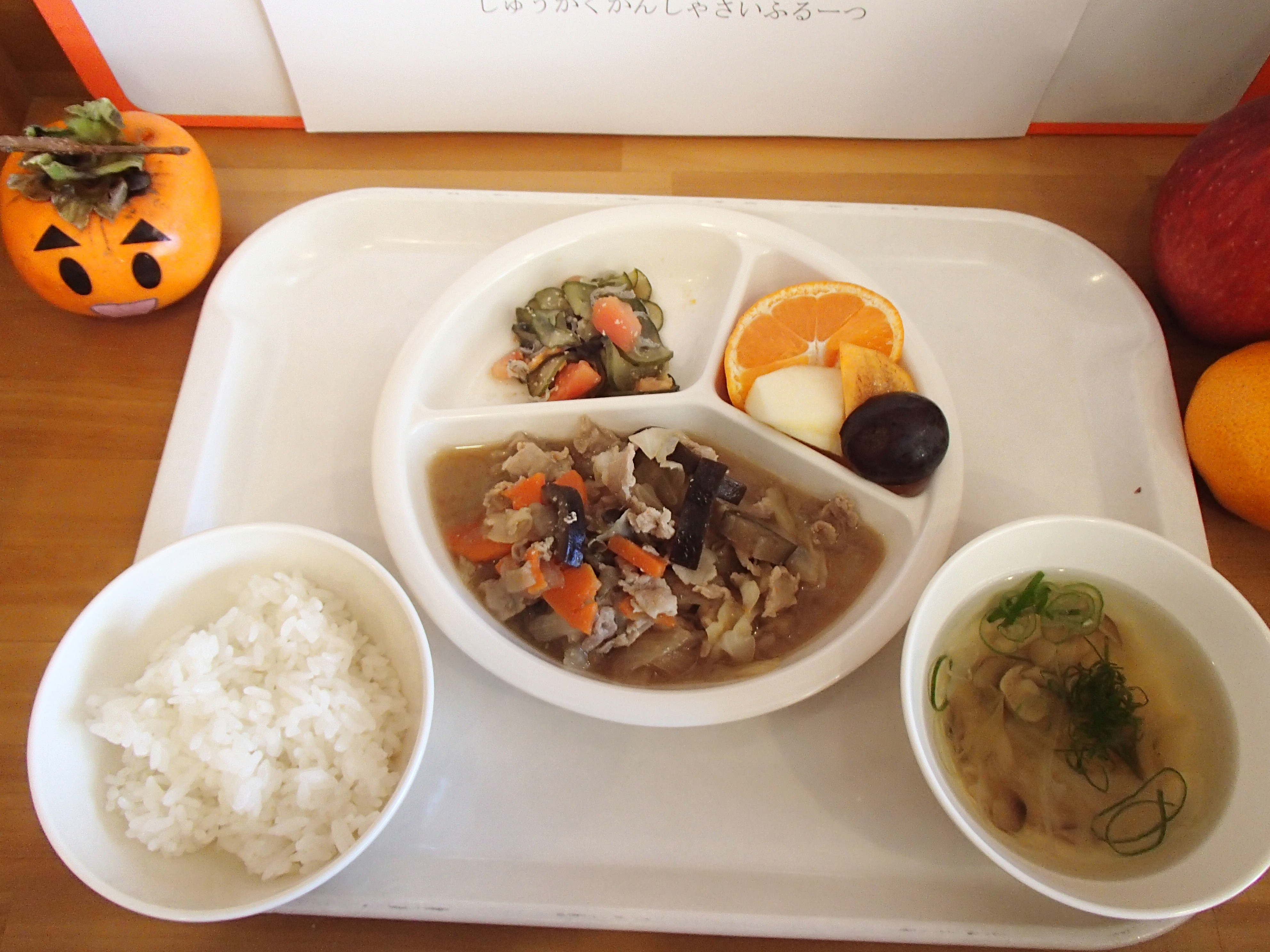 きのこご飯・さんまの揚げ浸し・秋なすのオランダ煮・柿・わかめと豆腐の味噌汁