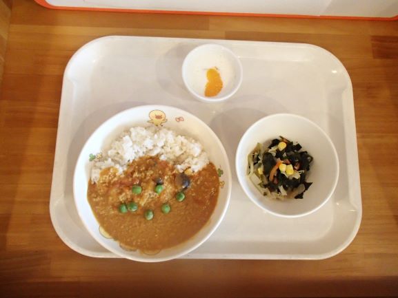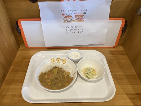 大豆入りカレー・ブロッコリーとコーンの和風サラダ・フルーツヨーグルト