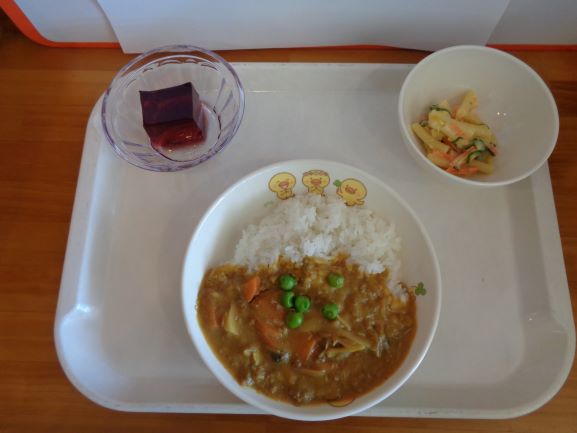 カレー(から揚げのせ)・マカロニサラダ・ぶどうゼリー