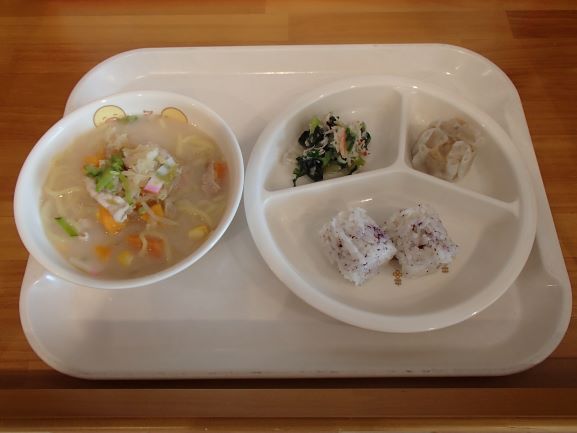 おにぎり(菜飯)・豚汁うどん・白菜のおかか和え・オレンジゼリー