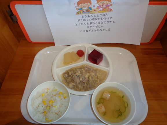 玄米ごはん・鶏肉の甘辛から揚げ・豆苗ともやしのごま和え・フルーツゼリー・じゃがいもと玉ねぎの味噌汁