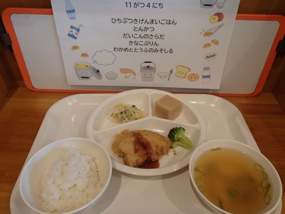 玄米ご飯・トンカツ・大根のサラダ・きなこプリン・わかめと豆腐の味噌汁