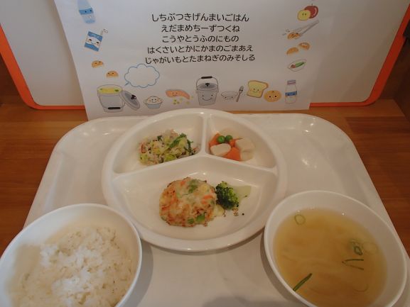玄米ごはん・鶏つくね(塩昆布・チーズ)・キャベツと焼き油揚げの和え物・高野豆腐の卵とじ・じゃがいもと玉ねぎの味噌汁