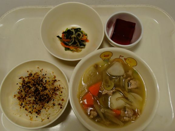 ふりかけごはん・芋煮・青菜ともやしの磯和え・りんごゼリー