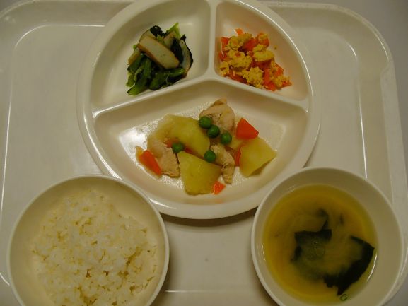 玄米ごはん・鶏塩じゃが・小松菜とさつま揚げのごま和え・人参しりしり・わかめと玉ねぎの味噌汁